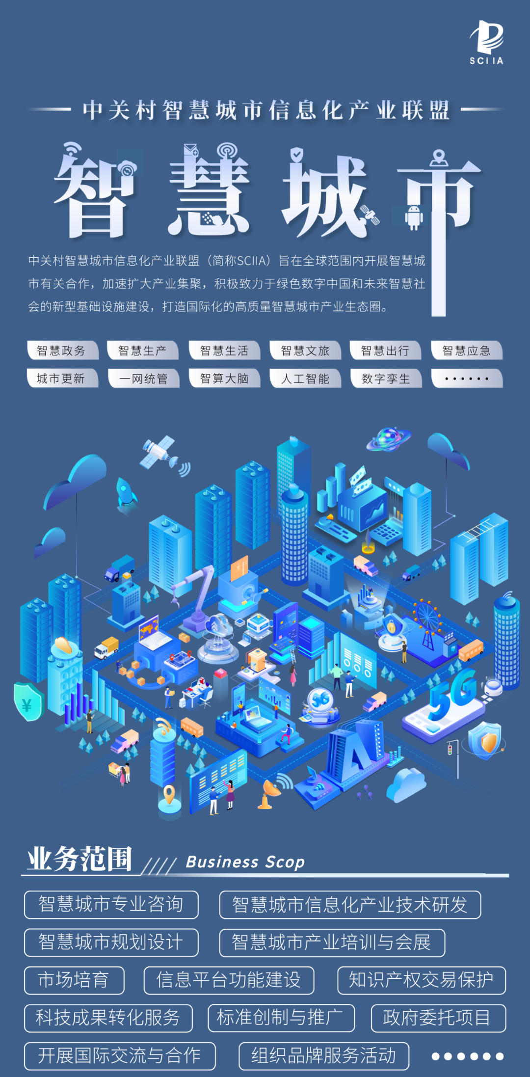 ]article_adlist-->联盟简介 /Profile/ ]article_adlist-->中关村智慧城市信息化产业联盟(ZhongGuanCun Smarter City Information Industry Alliance ,简称SCIIA)是成立于2015年,具有独立法人资格活动地域为全国的4A级社会组织,现有成员单位涵盖国内外智慧城市领域科研、制备、应用、检测和服务等方面的知名机构、大学、企事业单位。联盟主要业务包括——